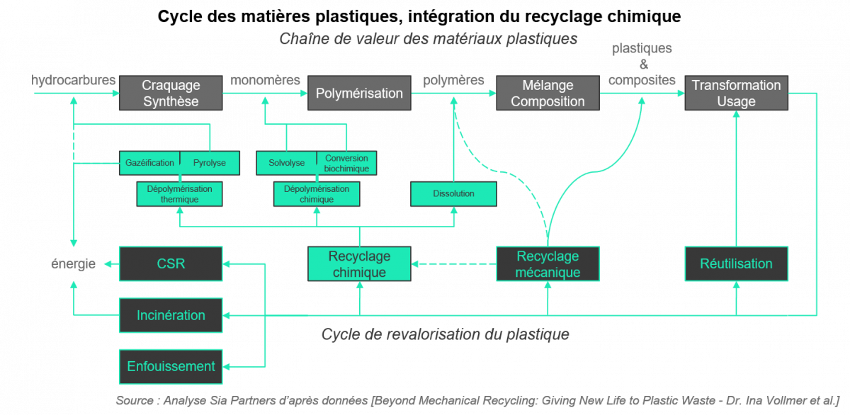 Pour faire un pas vers une économie circulaire, il faut traiter la part des plastiques collectés que le recyclage mécanique est incapable de traiter. Or, les différentes techniques de recyclage chimique, distinctes par leur méthode et la structure du produit en sortie, ont des avantages qui leur permettent de s’insérer à ce niveau dans la chaîne de revalorisation, de venir compléter le recyclage mécanique et d’éviter de recourir à l’incinération ou l’enfouissement.