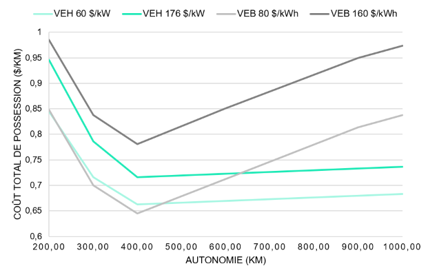 Figure 2. Évolution du coût total de possession des VEB et VEH selon le prix des piles à combustible et batteries et en fonction de l'autonomie. Ex : VEH 60$/kw – Véhicule à hydrogène avec un prix de pile à combustible fixé à 60$ par kw. Analyse Sia partners basé sur le rapport « Energy Technology Perspective » de l’AIE. [3]