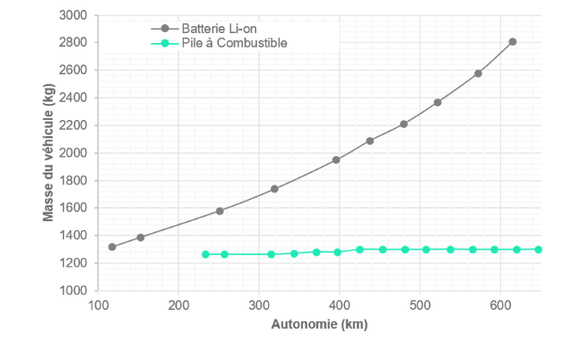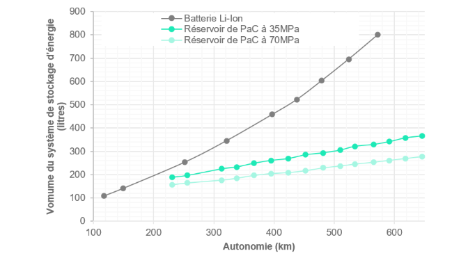 En dépit de progrès d’autonomie significatifs sur le marché des véhicules à batterie [1] et du développement de stations de recharge rapide, la pile à combustible bénéficie d’un avantage technique indéniable. Tandis que le volume et la masse des batteries croissent fortement avec les besoins en stockage d’énergie pour satisfaire le couple au démarrage des véhicules lourds ainsi que leur autonomie, ceux d’un réservoir d’hydrogène évoluent peu à mesure qu’augmente ce besoin.