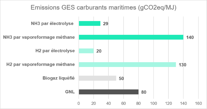 Figure 4. Comparaison des différents carburants alternatifs maritime. Émissions sur l’ensemble du cycle de vie, de l’extraction à la combustion. (Hypothèse d'électrolyse à partir de mix 100% ENR - utilisation) [6]
