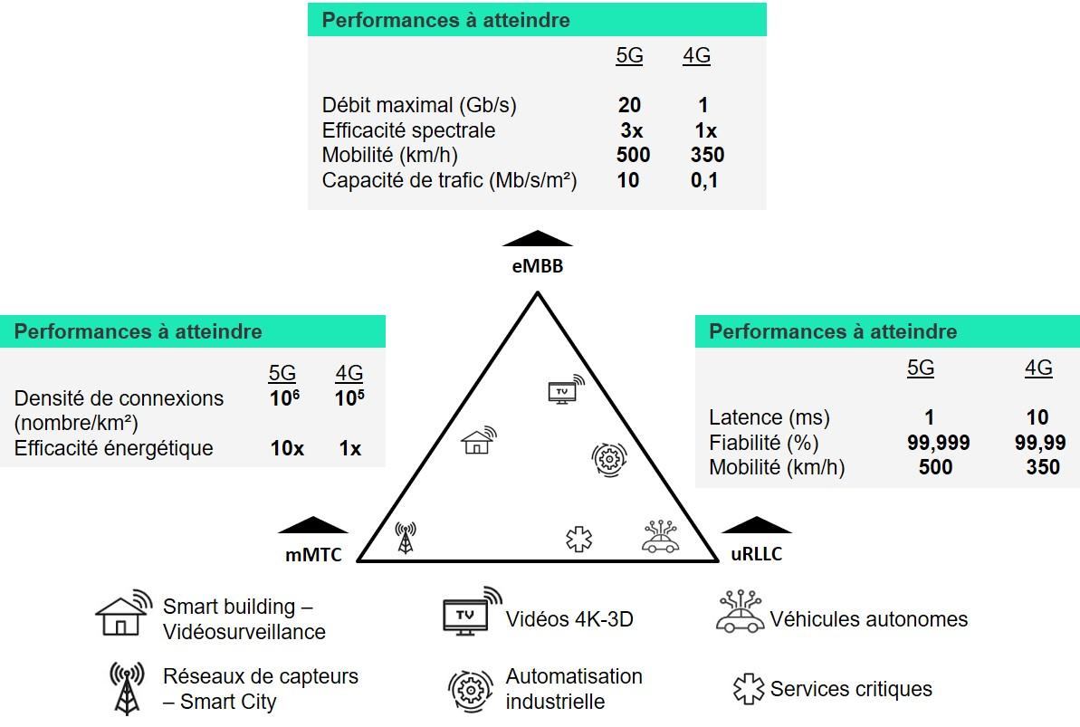 Pour satisfaire ces besoins hétérogènes, trois principales catégories de performances à atteindre pour la 5G ont été définies par l’UIT [i] :