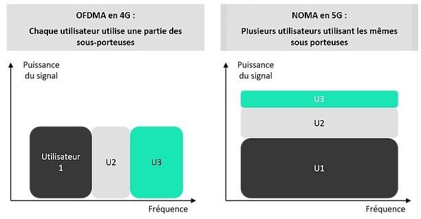 A noter qu’en 3G déjà, le CDMA (Code Duplexing Multiple Access) permettait aux utilisateurs d’utiliser les mêmes fréquences au même moment grâce à une « clé unique » attribuée à chacun des utilisateurs. Cette technique n’est pas applicable aux fréquences prévues pour la 5G car le codage du signal nécessite une fréquence 10 fois supérieure à celle du signal, ce qui se heurte à des limitations matérielles.
