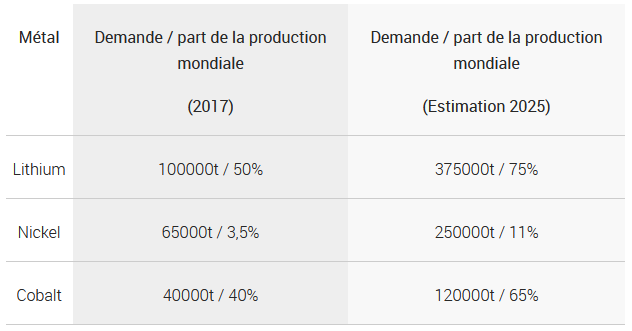 En 2018, les ventes mondiales de véhicules électriques et hybrides ont atteint les 1,26 millions d’unités, dont 769 000 en Chine. Sur les 96 millions de voitures vendues sur l’année, cela ne représente qu’une part de 1,3%, mais cette part est estimée atteindre 48% en 2030. Le cabinet McKinsey estime qu’en 2040, 70% des nouvelles immatriculations en Europe seront des véhicules 100% électriques, alors que certains pays européens ont même annoncé bannir les véhicules thermiques d’ici 2030 ou 2040. Cela impliquera une explosion de la demande en batteries.