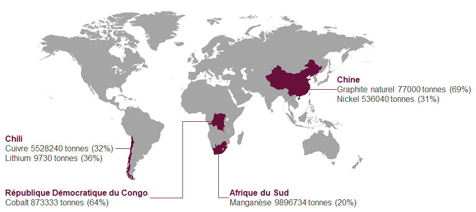Illustration 6 : production minière et part de la production mondiale des principaux pays producteurs de matières premières pour les batteries électriques. Source : COMMISSION STAFF WORKING DOCUMENT Report on Raw Materials for Battery Applications. Carte créée via mapchart.net ©