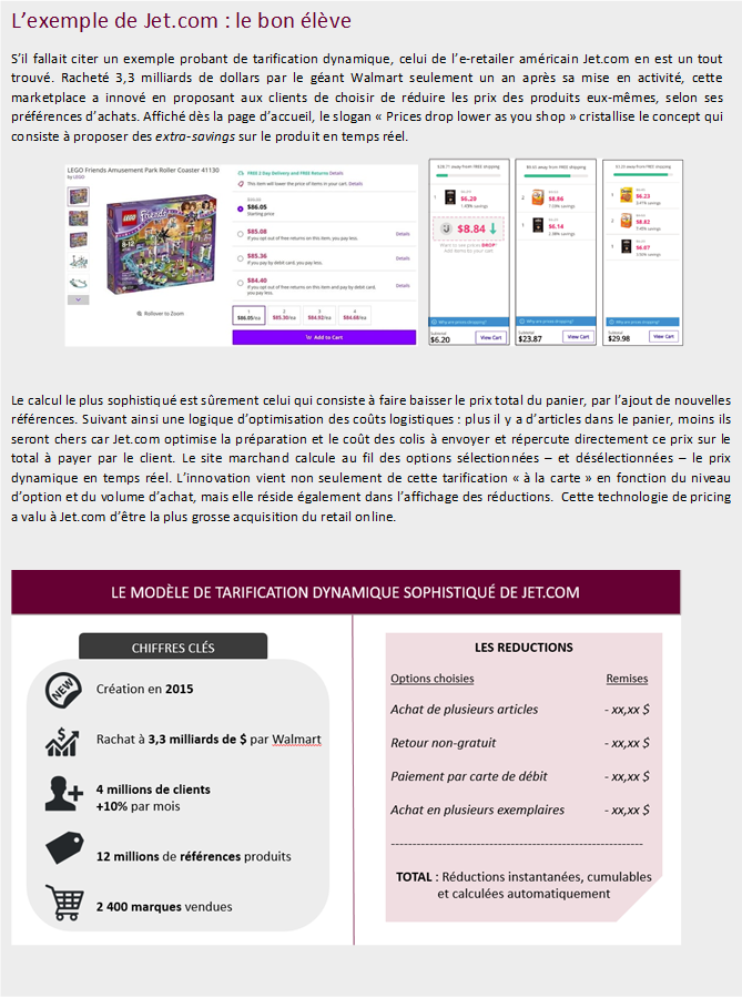 Que ce soit en magasin ou en ligne, les différents prix donnés à un même article se démultiplient : le dynamic pricing (ou tarification dynamique) se perfectionne au gré des avancées technologiques, notamment des analyses du Big Data pour la tarification, des puces électroniques RFID sur les articles, du machine learning pour les comportements clients ... Jusqu’à présent, le prix de vente était défini par des variables liées aux coûts (« cost based pricing ») et parfois, à la « propension » ou à la « disponibilité » du client à payer, de manière assez statique, manuelle et intuitive. Dorénavant, le retailer a plus facilement à sa disposition un éventail de données aussi bien internes (informations relatives aux anciens achats notamment) qu’externes (la météo par exemple), traitées en temps réel par des algorithmes adaptés à l’activité. Ainsi, les sites de e-commerce sont capables de déterminer à quel point les clients sont réceptifs et rapides à l’annonce d’offres en ligne. Le géant Amazon, qui a introduit le Dynamic Pricing dans le Retail, réalise en moyenne 2,5 millions de modifications de prix par jour en analysant les données recueillies en permanence par le site.