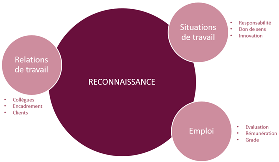 La reconnaissance du travail et au travail est un enjeu majeur de management pour les entreprises. L'enjeu est l'engagement des collaborateurs, selon une approche aussi bien négative (risque grave de désinvestissement au travail, désaffection, baisse de productivité, absentéisme, conflictualité, voire à terme, risque de santé) que positive (en temps de crise, bien reconnaître permet de compenser une propension plus faible à agir sur le levier de la rémunération). Pour répondre aux besoins de reconnaissance des salariés, les entreprises doivent d'abord l'identifier, ce qui n'est pas nécessairement chose facile.