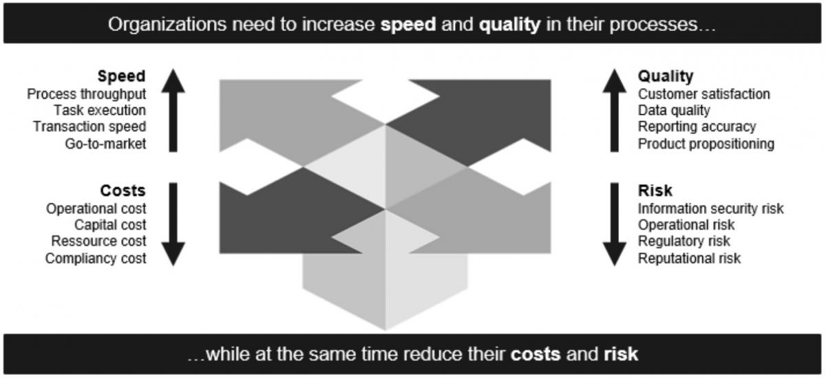 Process improvements in terms of speed, quality, costs and risks as mentioned in the previous paragraph. For example, improved customer and employee satisfaction as well as process efficiency gains and quality improvements.