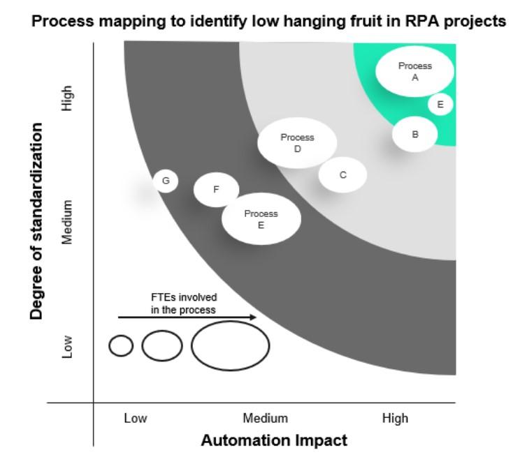 Figure 2: The two most important dimensions in identifying processes for automation projects: degree of standardization and organizational impact