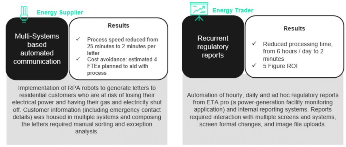 To exemplify what a qualified use case in the energy sector would look like, we’ve illustrated two cases of successfully executed RPA projects within an energy company in figure 4.