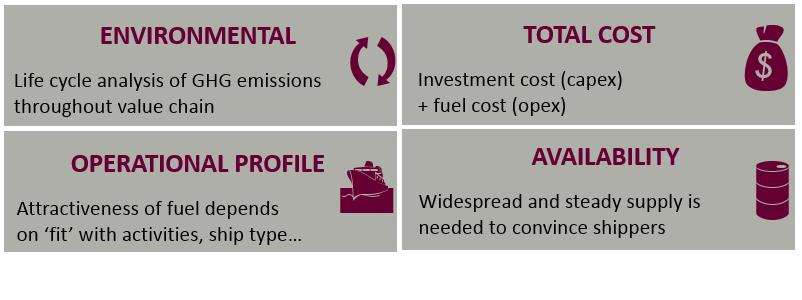 Assessing the potential of alternative fuels for shipping requires an evaluation of a great many factors. The main ones are of course the environmental performance of the fuel vs the total cost of using it for all stakeholders. The operational profile permitted by a fuel is a next important factor to consider, as well as widespread and long-term availability.