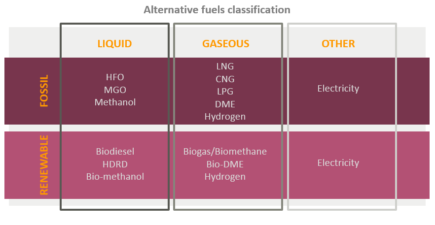 The above figure is a graphical categorization of the alternative fuels to HFO and MGO discoursed in this insight, which all offer increased environmental fuel performance. This article focuses in-depth on LNG, biomethane (bio-gas), electricity and hydrogen.