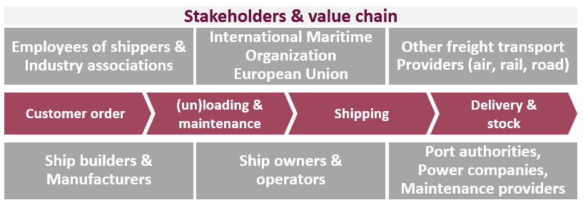 The complex stakeholder structure and the international nature of maritime shipping creates a third market barrier which explains why alternative solutions have mostly been deployed locally under proprietary ownership. Many interdependent stakeholders – i.e. ship owners, ship operators, port authorities – each differently influence the choice of the fuel used onboard the ship fleet, driven by individual financial incentives and sustainability agendas. For example, ship builders and engine manufacturers influence the fuel choice by deciding on propulsion and abatement technologies onboard ships in the order fulfilment process. Next, the shipping operators, who either own or lease ships, order the fuel which is compatible with the ship’s propulsion technology and influence the fuel demand. Then, port authorities and terminal operators are responsible for providing necessary fuel bunkering infrastructure and fuel security at the ports.