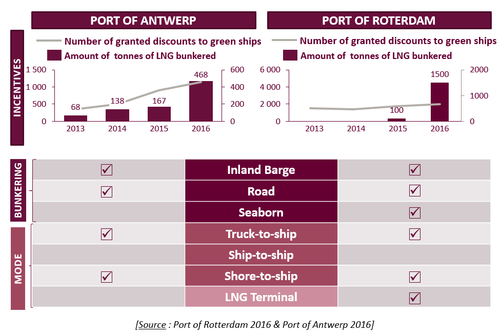 The figure above demonstrates how the volume of LNG bunkering at Port of Antwerp has consequently increased the past years. The port of Rotterdam has gone a step further and combines both incentives and penalties for “green ships”, with respectively up to 30% discount or 10% surplus on port fees.